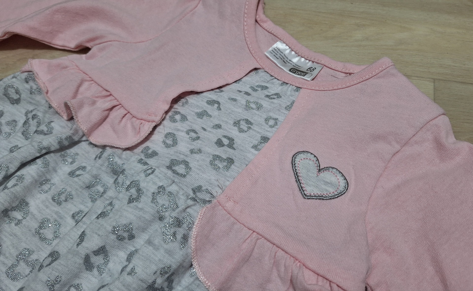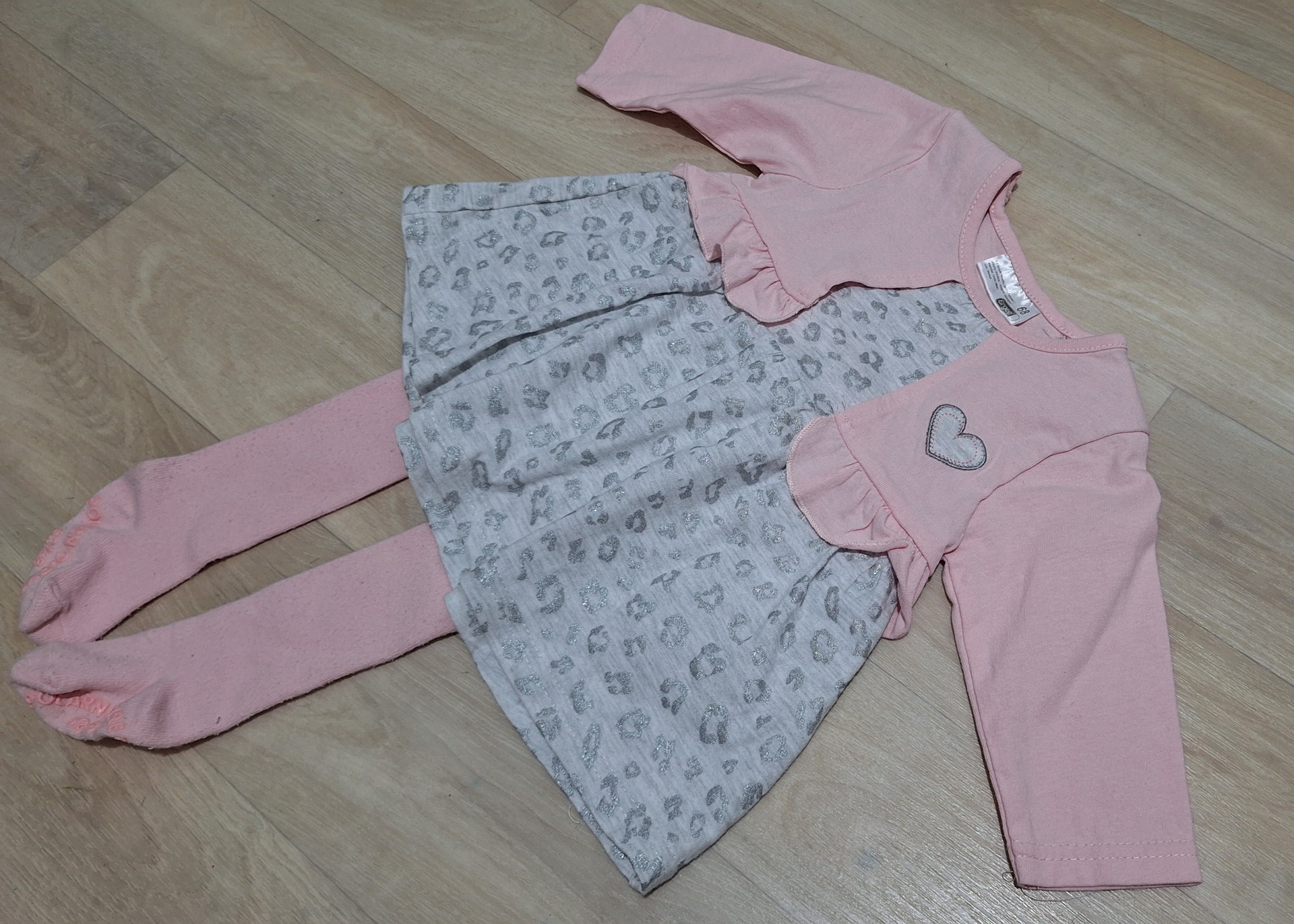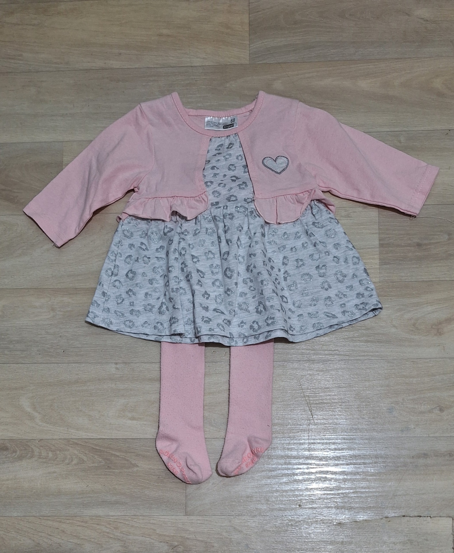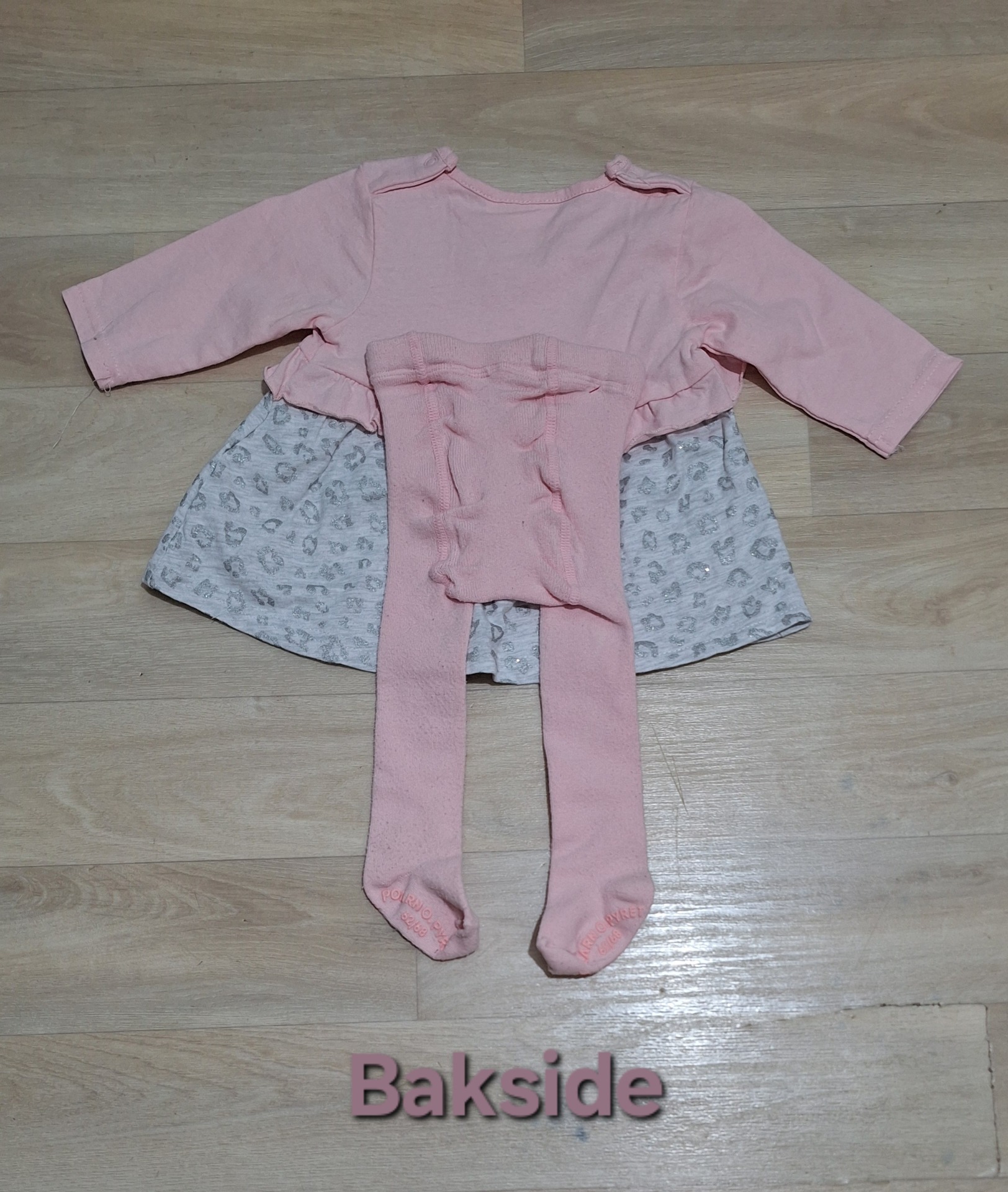 Hverdagskjole med syddpå jakke. Strømpebukse fra Polarn O. Pyret, antiskli (62-68).