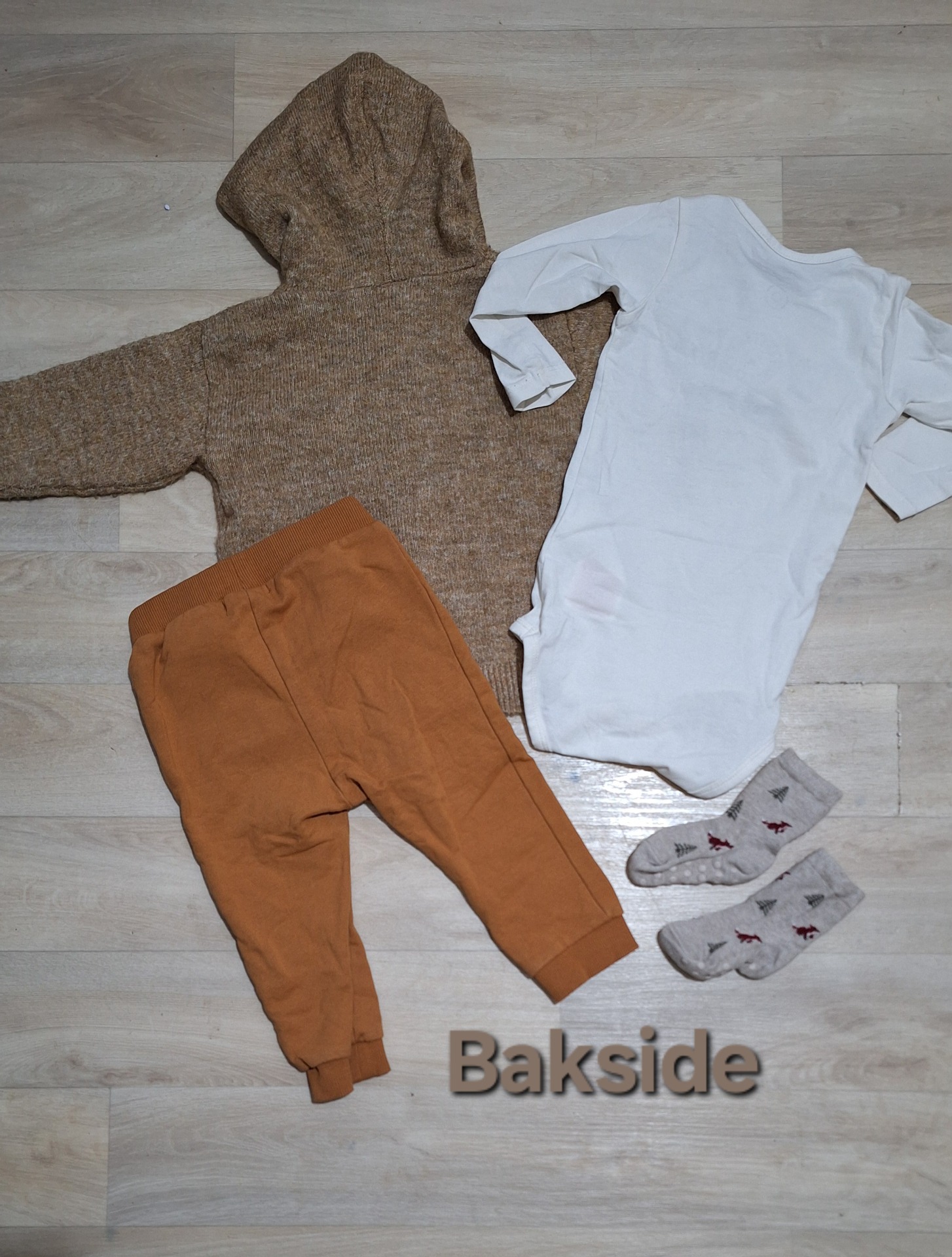 Søt sett - bukse og body er fra Name It. Genser fra H&M er varm, myk og deilig. Sokker med antiskli er gratis, med på kjøpet.